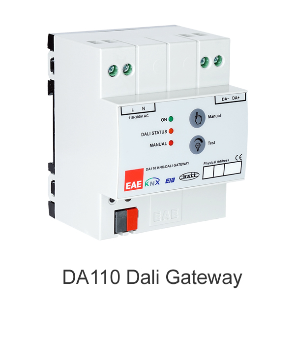 DA110 KNX-DALI Gateway, KNX ve DALI veri yolu arasında bir arabirim aygıtı olarak çalışır. Cihaz DALI hattında bulunan 64 DALI cihazını farklı KNX objeleri üzerinden ayrı ayrı kontrol edebilir. DALI hattı DA110'un dahili güç kaynağı tarafından beslenir. Ayrıca DALI uyumlu ECK (acil durum kiti) cihazları bir test programında çalıştırılabilir.